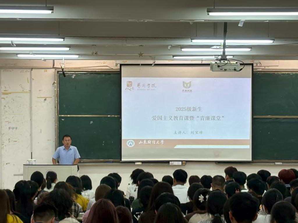 学院党委书记刘宝璋讲“入学教育第一课”——爱国主义教育课暨“青廉课堂”, 以“纪念中国人民抗日战争暨世界反法西斯战争胜利80周年”为主题,希望全体新生,把青春奋斗融入中华民族伟大复兴新征程,立大志、明大德、成大才、担大任,坚定不移听党话、跟党走!